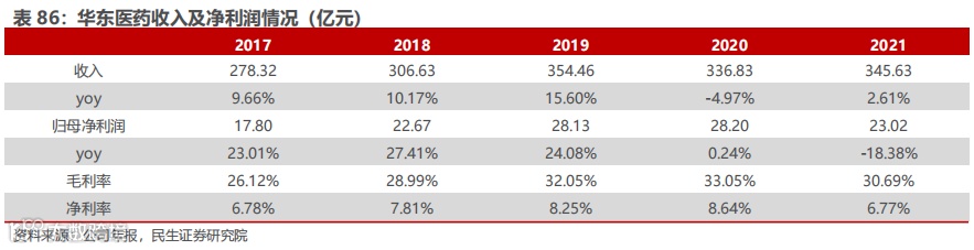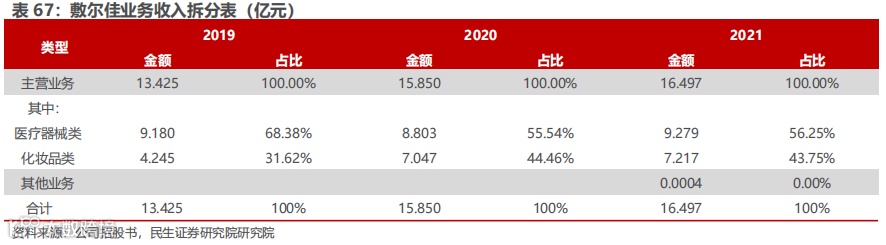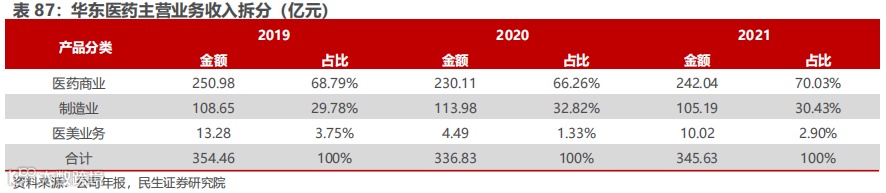 公司业务分为医药商业、制药板块、工业微生物以及美容护理,其中医药商业贡献主要收入来源。截至2021年公司医药商业板块业务占比达到70%,医美业务收入占比存在一定波段,2019-2021年收入占比分别为3.75%/1.33%/2.9%。