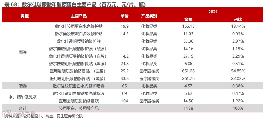 2)妆字号产品:玻尿酸和胶原蛋白产品共有8款,其中胶原蛋白产品有3款,包括敷尔佳胶原蛋白水光修护贴、敷尔佳胶原蛋白多效修护贴、敷尔佳胶原蛋白水光修护喷雾,2021年三者销售收入占化妆品收入比重分别为21.64%、1.53%、0.63%;玻尿酸产品主要有5个:敷尔佳透明质酸钠修护膜、敷尔佳透明质酸钠修护膜(黑膜)、敷尔佳透明质酸钠修护贴(白膜)、敷尔佳透明质酸修护贴(黑膜)、敷尔佳透明质酸钠水光精华液,2021年5种产品销售收入占化妆品收入比重分别为4.89%、1.96 %、3.77%、0.84%、0.78%
