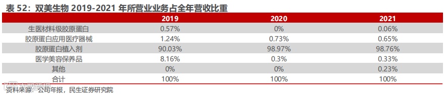 押宝胶原蛋白植入剂细分领域。胶原蛋白植入剂为双美生物主营项目,该产品把胶原蛋白对止血及细胞的亲合性的优点应用于伤口修复上。公司于2009年取得国家药品监管管理局的医疗器械注册证并上市以来经过四代产品的更迭。目前第四代产品已于2018年开展人体临床试验,目前已成功完成252例有效受试者的注射受测,临床试验中,全敷受试者无不良反应,临床结果较为成功,效果良好,截至2021年胶原蛋白植入剂收入占比达到98.76%。