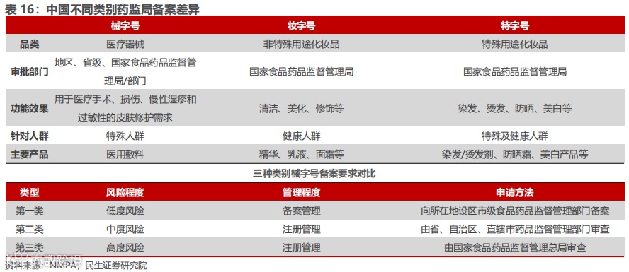 1)贴式医用敷料具有较为严格的政策要求,备案时长远超过妆字号产品。医用敷料因主要用于皮肤组织、创面损伤修复,需要按照医疗器械注册管理办法执行,存在由一类至三类的备案种类,风险程度由低到高,企业申请拿证的难度也由低至高,其中一类医疗器械首次注册平均周期在1-3个月、二类医疗器械首次注册的平均周期为1-2.5年、三类医疗器械首次注册的平均周期为1.5-3年,周期均长于妆字号产品(约半个月)。此外,2021年底,国家药监局明确要求医用冷敷贴需按照二类及三类进行备案,进一步加大了贴式敷料的监管力度,也增强了行业进入壁垒。