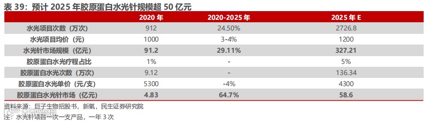 3)基于新氧APP中胶原蛋白水光针疗程销量占总水光针类销量接近1%,假设胶原蛋白水光针疗程占比约1%,在重组胶原蛋白的推动下,2025年占比提升至5%;