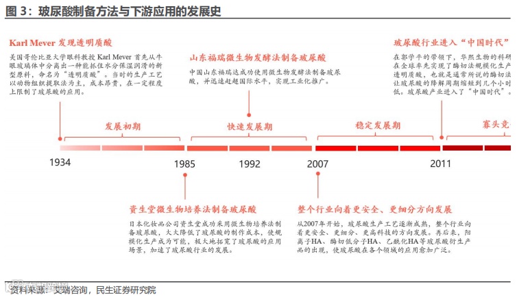 玻尿酸原料的早期采用动物源提取技术,随着技术推动下,主流制备方法为微生物发酵法,加速了玻尿酸市场应用。1934 年,眼科专家卡尔·迈耶(Karl Meyer)与助手约翰·帕尔默(John Palmer)在牛眼玻璃体中分离出了一种含糖醛酸和氨基糖的高分子多糖,并用“玻璃酸”命名;1970年开始,玻尿酸作为关节润滑剂;1980年被护肤界关注;2004年首款玻尿酸注射剂获批。玻尿酸发展至今,其生产工艺可分为动物组织提取法、微生物发酵法和合成法三种。其中,动物组织提取法制备主要来源干鸡冠和猪、牛、羊的眼睛玻璃体等,但原料来源有限,提取成本高、收率低,售价昂贵。当下主流方式为微生物发酵法制备,微生物发酵采用葡萄糖作为碳源发酵液,在培养基中发酵48小时,发酵结束后过滤除去菌丝体和杂质,然后用醇沉淀法等简单操作即得到高纯度的产物。采用发酵法制造的透明质酸能按商品设计来设定分子量大小,满足不同用途的需求,实现了规模化生产,极大降低玻尿酸的制备成本,也拓宽了玻尿酸的市场应用。