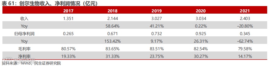 创尔生物深耕于活性胶原原料、医疗器械及生物护肤品领域,公司毛利率较高,且维持在较稳定水平。公司成立于2002年8月20日,是一家深耕于活性胶原原料、医疗器械及生物护肤品领域,集研发、生产、销售于一体的高新技术企业。其拥有的生物医用级活性胶原大规模无菌提取制备技术,解决了动物源性胶原提取过程中病毒灭活和免疫原性控制两大行业技术痛点,同时取得了液态胶原在有效保持天然构象和生物活性的前提下进行大规模无菌生产的技术突破。创尔生物在2017-2021年公司收入由1.35亿元增长至2.4亿元,CAGR达到15.47%,归属母公司股东的净利润由0.27亿元增长至0.35亿元,CAGR为6.82%。