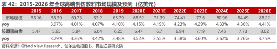 未来胶原蛋白在高端创伤敷料蓝海市场仍有挖掘空间,此外,组织工程、再生医学等领域也具备发展潜力。相比于传统的创伤敷料在临床应用中的局限性,现代发展起来的高端创伤敷料具有更优越的性能和对特定场景更好的适用性,也具备减轻换药痛苦、缩短愈合时间、减少换药次数、降低医务人员的劳动强度、降低综合治疗成本、换药操作简便易行等多种优点,近年来,高端创伤敷料在市场中的需求也日渐迫切,根据Grand View Research,2019年全球高端创伤敷料市场规模达65.79亿美元,其中胶原类高端创伤敷料市场规模达到6.25亿美元,预计2025年市场规模有望达到7.73亿美元。此外,医用胶原蛋白因其出色的修复、引导再生能力和生物相容性,在组织工程和再生医学等最前沿的医学领域中有巨大潜力。相比之下,玻尿酸具备良好的保水性、润滑性、生物降解性以及生物相容性,在肿瘤治疗靶向药物载体和骨骼再生等医药科技前沿领域有较大的应用潜力。