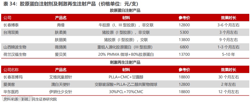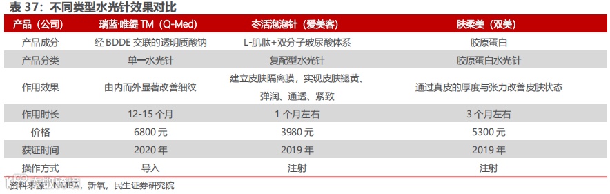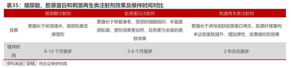 2)水光针市场:基础水光针主要作用是将小分子的玻尿酸输入皮肤皮层从而达到保湿补水的效果。随着医美的逐渐普及、项目增多,消费者需求也开始越来越多元化,例如补充营养成分实现皮肤状态自然、改善敏感肌、改善油皮痘肌、全能功效等。市场也开始发展对应的项目,例如通过不同产品复配成分,来达到多元化的目的。但复配型玻尿酸注射剂在获证难度高于一般玻尿酸产品,且拿证周期也远长于成分相对单一的注射剂,相比之下,胶原蛋白注射剂综合优势更为突出。