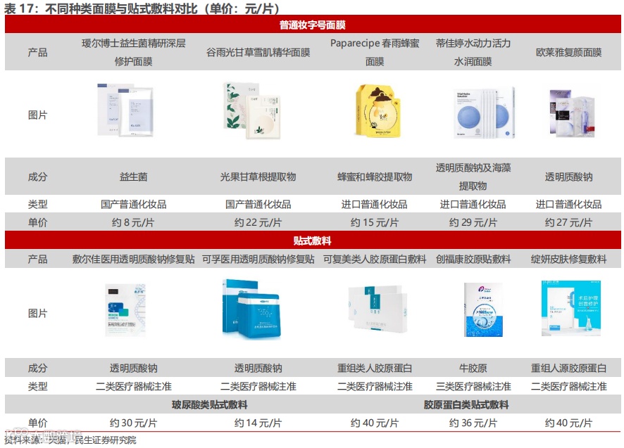 2)在更严格的监管以及更繁琐的流程之下,贴式敷料相较普通妆字号面膜产品有更高溢价,且胶原蛋白类贴式敷料定价高于玻尿酸类产品。从各产品价格对比看,普通妆字号面膜定价在8-30元/片,而贴式敷料面膜价位在14-40元/片;此外,胶原蛋白贴式敷料价格在35-40元/片,玻尿酸贴式面膜价格带在14-40元/片,胶原蛋白类产品呈现更高溢价。