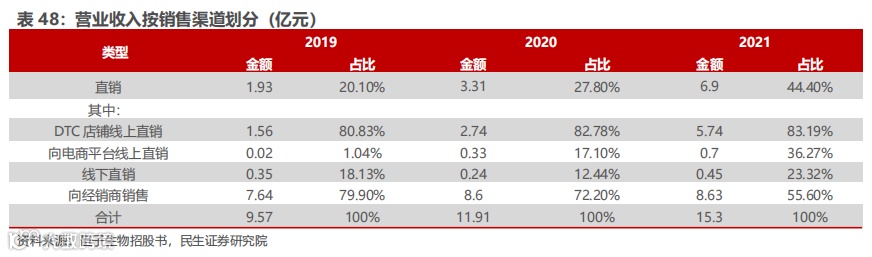 渠道角度,医疗机构和大众消费者双轨销售策略。巨子生物的主要业务面向医疗机构和大众消费者两个市场。TOB端,通过线下直销和经销商的方式,公司将产品销售和经销至中国1000多家公立医院、约1700家私立医院和诊所以及约300个连锁医药品牌。TOC端,主要有线上和线下两种销售模式:1)线上,公司主要通过电商平台以及社交媒体平台(天猫、拼多多、抖音等)上的DTC店铺进行直接销售,此外,向京东以及唯品会等电商平台的自营部门进行销售。2)线下,公司采取直销加经销商的策略,经销网络覆盖个人消费者以及屈臣氏、调色师、Ole等化妆品连锁店及连锁超市的约2000家中国门店。按销售渠道划分,2021年公司直销和经销的营业收入分别为为 6.89亿元、8.63亿元,直销占比44.4%,经销占比55.6%。