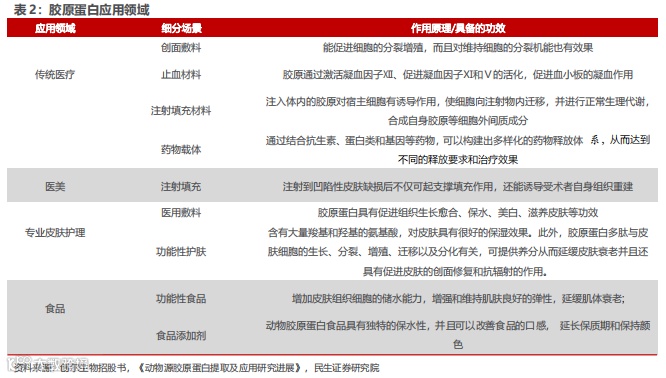 1)传统医疗,基于其生物相容性和诱导细胞分裂增殖等特性,运用于创面敷料、止血材料、注射填充材料以及药物载体等领域。