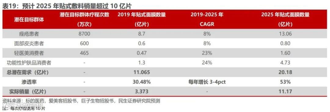 未来轻医美市场消费者需求和功能性护肤需求将成为行业增长的核心驱动力。基于贴式敷料的潜在消费群体分类情况,我们认为未来痤疮患者及面部皮炎患者疗程次数稳步增长,而轻医美需求高增下对应术后修护需求将呈现较快增长,同时功能性护肤需求(主要为皮肤学级护肤需求)也将成为行业增速的拉动力,据我们测算预计2025年贴式面膜销量有望超过10 亿片,2019-2025年CAGR达到22%。