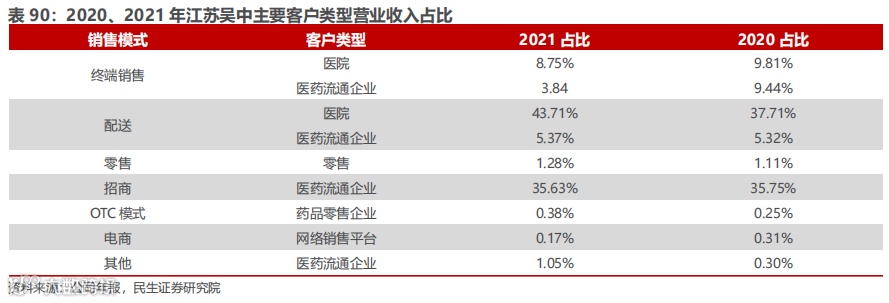 配送模式为主,客户多来自于江苏。公司目前以自营终端销售模式、配送模式、招商模式、OTC、电商模式等几种模式为主,销售渠道包含全国各区域内的代理商、医疗机构和零售药店等。公司最主要的销售模式为配送模式,2021年公司营业收入中通过配送模式取得收入占比达49.08%,其中医院客户占比达43.71%。从客户分布地区来看,公司的主要客户集中在江苏省。目前公司拥有两家医药销售子公司,并组建了经营销售管理部、商务管理中心、中央市场部等部门,在全国范围内有着多个销售中心。