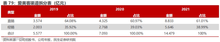 渠道角度看,公司以直销为主模式进行销售。2021年公司直销和经销的营业收入分别为33.41/16.07亿元,占比分别为67.52%/32.48%。其中零售端线上直销模式包括平台合作模式和自有平台模式,即华熙生物与天猫、淘宝等平台签订平台服务协议,在平台开设店铺(旗舰店、专卖店等)面向终端用户进行销售。自有平台模式即公司利用微信小程序、有赞商城等技术服务商,搭建官方渠道直接面向个人消费者进行销售。线下渠道公司采用经销商销售为主的模式,公司将产品以卖断方式销售给经销商,经销商再另行向终端客户进行销售。