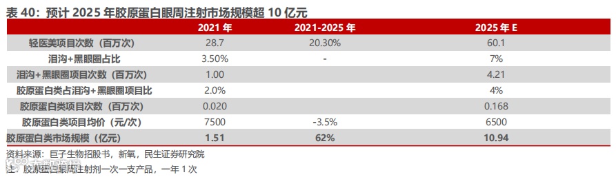 3)据新氧APP中统计,胶原蛋白类产品去泪沟和黑眼圈占比近2%,假设2025年增长至4%;
