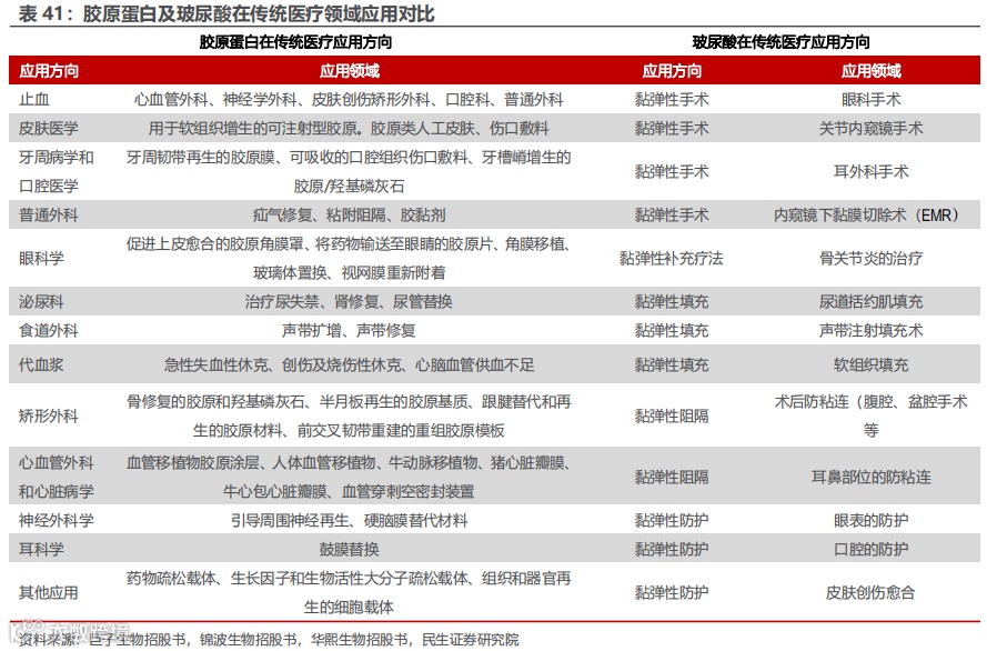 胶原蛋白应用领域与玻尿酸存在一定差异。胶原蛋白凭借其良好的生物力学性能、生物相容性以及与宿主良好的协调性,主要的应用领域包括创面敷料、止血材料、注射填充材料以及药物载体等;而玻尿酸在医药和临床诊治中主要应用在粘弹性手术、粘弹性补充治疗、粘弹性填充、粘弹性阻隔、粘弹性防护以及药物载体,两者因材料特性不同,在传统医疗领域应用差异较大。