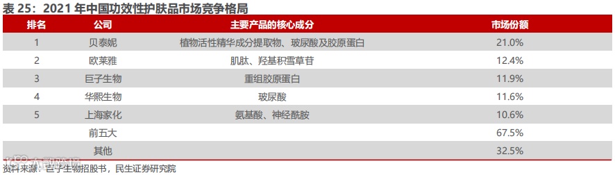 各企业通过与需求功效及对应活性成分绑定,形成消费者强品牌意识,进一步占领市场份额,呈现出功效性护肤市场集中度较高。中国功效性护肤市场中,前五大企业分别为贝泰妮、欧莱雅、巨子生物、华熙生物和上海家化,2021年市场份额分别为21% / 12.4% / 11.9% / 11.6% / 10.6%,CR5达到67.5%,远高于护肤品市场CR5(不到25%)。其中贝泰妮主打修护活性成分满足消费者舒敏修护需求,华熙生物围绕保湿成分主打玻尿酸,欧莱雅主打修护和抗衰,巨子生物主打美白、修护及抗衰,上海家化主打保湿和温和。