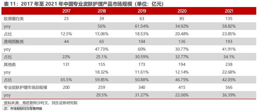 中国专业皮肤护理市场规模呈现高速增长,其中胶原蛋白和玻尿酸类产品占据过半市场。按零售额计,2021 年中国专业皮肤护理市场的整体规模为566 亿元,从原料角度看,其中胶原蛋白专业皮肤护理市场规模135亿元,占比约为23.9%;玻尿酸专业护理产品市场规模193亿元,占比约为34.1%。