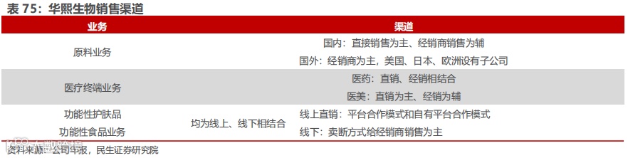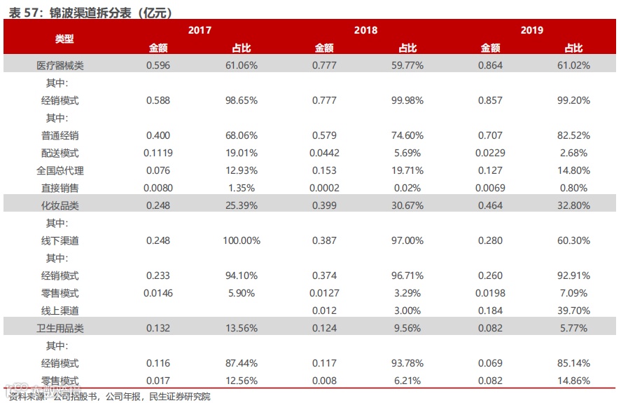 锦波生物销售渠道模式多样。公司医疗器械终端产品采用经销为主的销售模式,具体细分为普通经销模式、配送经销模式及全国总代理模式,同时部分医疗器械产品采取直接销售模式;公司化妆品主要采用线下和线上两种渠道进行销售,线下渠道以经销模式为主,同时,随着电子商务的快速发展,公司也逐步建立了线上渠道,销售收入逐年增长;公司卫生用品主要采用线下经销模式,主要通过经销模式销售给专业美容院或诊所,并最终销售给消费者。同时,少部分卫生用品直接销售给个人客户、美容院、诊所等。