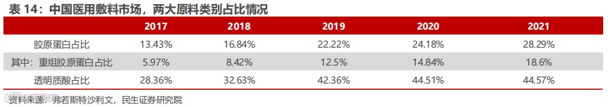 贴式医用敷料成分多样,大多主打修复类功能,其中以玻尿酸或胶原蛋白为核心原料的贴式敷料市场占比较大,且重组胶原占比快速提升。目前市场上贴式医用敷料的常用成分里包括胶原蛋白、玻尿酸和其他(壳聚糖、富勒烯、抗菌肽等):胶原蛋白促进保湿修复;玻尿酸具有锁水、保湿、润滑功能;壳聚糖抑菌止血、富勒烯可以抵抗光老化、抗菌肽能够抑菌。从市场规模角度, 2021年胶原蛋白敷料市场占医用敷料市场比为28%,透明质酸市场占比达到45%,同时结合贴式医用敷料为主要市场(2020年占比达到近80%),推断预计胶原蛋白和透明质酸类的贴式敷料占据贴式敷料较大市场。此外,根据弗若斯特沙利文,重组胶原蛋白类医用敷料占比持续提升,也进一步体现了重组胶原蛋白对胶原蛋白贴式敷料市场增长的推动。