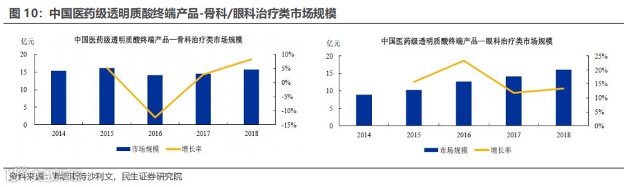 胶原蛋白和玻尿酸在国内传统医疗终端的运用市场规模占比较大,且规模均呈现稳步上行。在传统医疗领域,胶原蛋白和玻尿酸类材料近年来国内市场稳步发展:根据弗若斯特沙利文,基于胶原蛋白的生物医用材料市场规模从2017年的10亿元人民币增长至2021年的32亿元人民币,CAGR达33.5%;玻尿酸因其良好的生物特性,被广泛应用于骨科、眼科、软组织填充等医药领域中,根据研究机构弗若斯特沙利文2019年的分析;在骨科细分领域中,中国2018年骨关节炎注射类药物市场规模约为98亿元,其中玻尿酸终端产品的市场规模约为15.7亿元,占比达16%;在眼科细分领域中,医药级透明质酸眼科终端产品的市场规模约为16.1亿元。