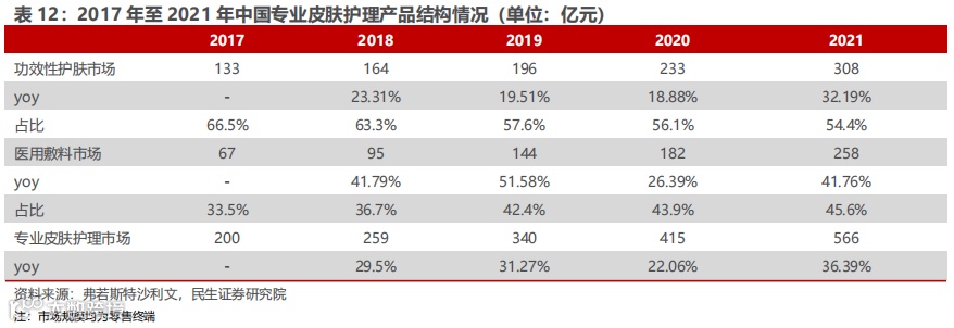 1)功效性护肤市场从2017年的133亿元增长至2021年的市场规模达到308亿元,2017年至2021年的复合年增长率为 23.4%;截至2021年占整体皮肤护理市场规模达到54%。