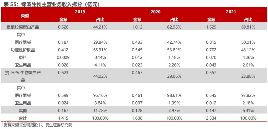 公司以功能蛋白为核心原料的产品销售规模不断扩大。锦波生物主营业务涵盖应用于医疗器械、功能性护肤品、原料和卫生用品中的重组胶原蛋白产品以及应用于医疗器械和卫生用品中的抗HPV生物蛋白产品,2019-2021年收入分别为 1.415亿元、1.608亿元和2.334亿元,截至2021年重组胶原蛋白产品收入规模占比接近70%。