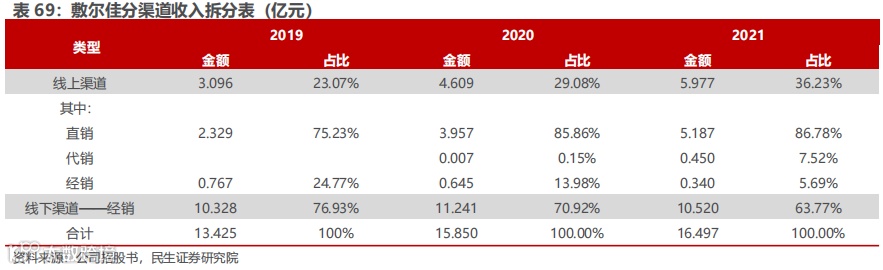 销售渠道以线下为主,线上为辅模式。2021年公司线上渠道销售收入占比为36.23%,进一步分为直销、代销和经销三种模式,且以直销为主,21年占线上收入比重为86.78%。三种销售模式的销售收入分别占线上渠道销售收入的比重为86.78%、7.52%、5.69%。在线下渠道中,公司采用的为经销模式,且公司将经销商分为甲、乙、丙三类,分级管理的经销商主要面向美容机构、 连锁零售药店等终端渠道。