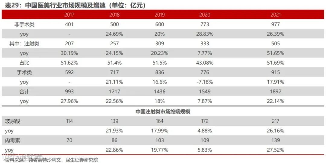 但从规模上看,水光针市场仍有待提升。根据艾媒咨询,2020年中国轻医美用户规模约1520万人,水光类注射人数约为200-450万人,仅占轻医美用户的1/7或1/3;中国已注射针剂的医美用户中,仅有34%的用户接受过水光项目。同时结合消费频次和消费单价,据我们测算2020年水光针市场规模约不到100亿元。