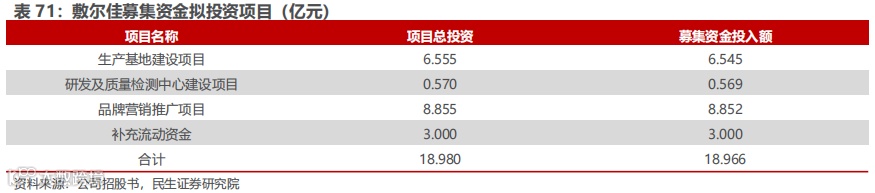 敷尔佳计划公开发行股票募集资金将主要用于品牌推广和生产及检测基地扩建。其中生产基地建设项目拟实现敷尔佳医用透明质酸钠修复贴(白膜)、敷尔佳医用透明质酸钠修复贴(黑膜)、敷尔佳透明质酸钠修护膜、敷尔佳胶原蛋白水光修护贴等产品的扩产,计划投入募集资金6.555亿元,占总募集资金的34.51%。研发及质量检测中心建设项目计划主要为对功能性护肤品和医用胶原蛋白敷料进行研发,投入募集资金0.57亿元,占总募集资金的3%。