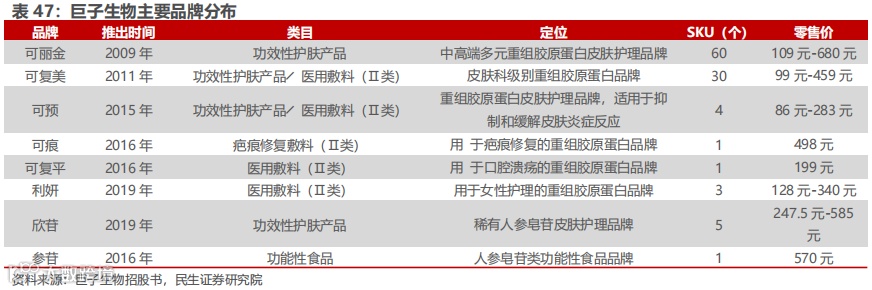 两大旗舰品牌共驱收入持续增长。基于公司的合成生物学技术平台,巨子生物通过自主研发推动品牌持续上行,公司旗下的品牌包括可复美、可丽金、可痕、可复平等。其中公司的领先品牌可丽美于2009年推出,主打中高端多功能皮肤护理市场,其主要功效为抗衰老、皮肤保养及皮肤修护;另一大领先品牌可复美于2011年推出,旨在提供皮肤修复和其他护肤解决方案,为中国首款获得此类注册的基于重组胶原蛋白的产品,品牌发布之初是作为面向专业医疗机构客户的皮肤科级别专业皮肤护理品牌,由于该其功效和安全性自上市之初迅速受到医学界的认可和商业上的成功,公司随后将其推广至大众市场。