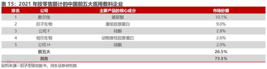 竞争格局角度,国内医用敷料市场两大头部企业分别为以玻尿酸为核心成分的敷尔佳和以重组胶原蛋白为核心成分的巨子生物。2021 年,医用敷料市场 CR5 为 26.5%。在胶原蛋白领域,巨子生物实现 23 亿元销售额,占据9%的市场份额,在医用敷料整体行业位居第二,在胶原蛋白医用敷料细分市场中排名第一。