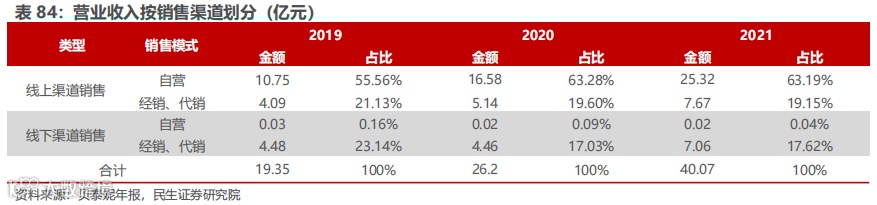 以薇诺娜品牌为核心,坚持走产品专业化路线。薇诺娜为公司核心品牌,对应拉动公司护肤品收入由2019年的16.80亿元增长至2021年的36.29亿元,CAGR达到46.97%;从渠道角度看,公司深度绑定“专业护肤”理念,以线下大药房/OTC等专业化渠道为基础,同时把握线上高增速机遇,持续多样化平台布局,2021年公司线上销售收入33.00亿元,占比82.04%;线下销售收入7.23亿元,占比17.96%。