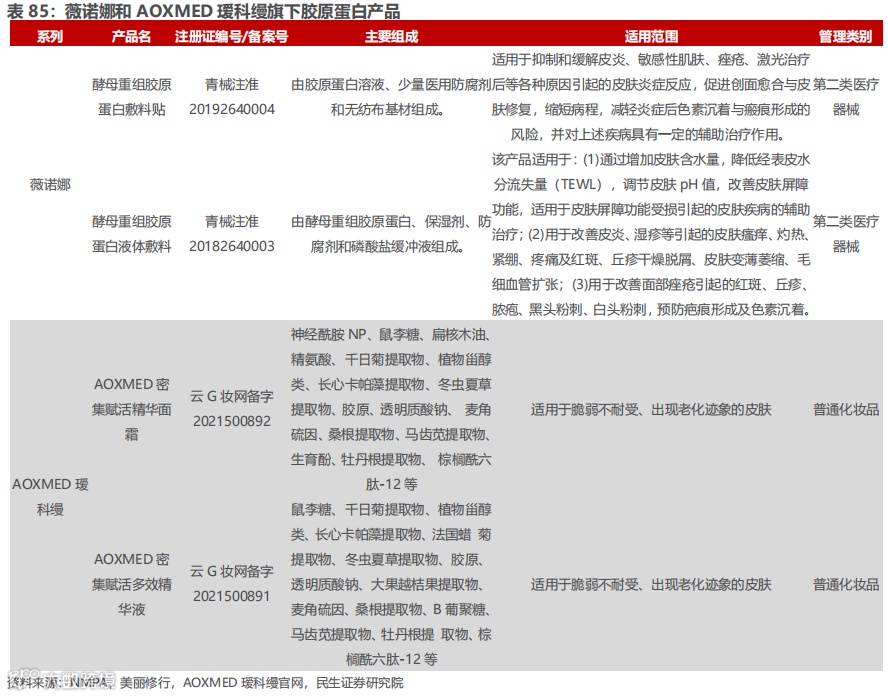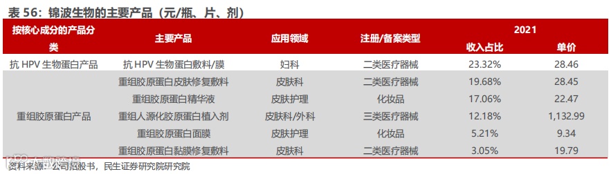 产品聚焦功能蛋白,种类丰富。公司胶原蛋白的主要产品有抗HPV生物蛋白产品和重组胶原蛋白产品两大类,其中重组胶原蛋白产品系列较多,类别包括二类和三类医疗器械产品和化妆品。