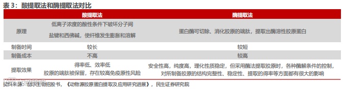 1)天然胶原以酸法提取和酶法提取法为主。天然胶原提取方法多样,包括酸提法、酶提法、中性盐提取法、碱提法等,基本的原理都是通过改变蛋白质的环境条件来使胶原蛋白从其他蛋白质中分离。目前酸提法和酶提法是胶原蛋白提取工艺中最常用的方法,主要因组织中绝大部分胶原交联程度较高,需要酸性条件或酶处理后溶解。相较于酸提取法,酶提取法的优势更为显著,主要表现为反应速度快、提取率高,所得胶原蛋白纯度高、性质好。