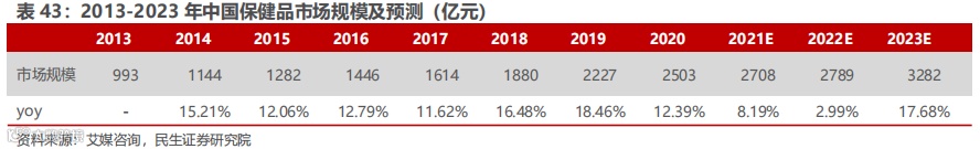 保健品市场主打多样化功能性,胶原蛋白和玻尿酸均有布局。保健品又称营养补充剂,是一种成分是从食物中萃取对人体有益的营养素的补充品。通常对人体有益的营养素包含氨基酸、微量元素、和矿物质等。随着社会的发展水平不断提高和国民对健康生活的需求逐渐增长,保健品市场也在近年蓬勃发展,根据艾媒咨询,中国保健品市场从2013年的993亿元人民币增长至2020年的2503亿元人民币,CAGR达12%,预计2023年增长至3282亿元。