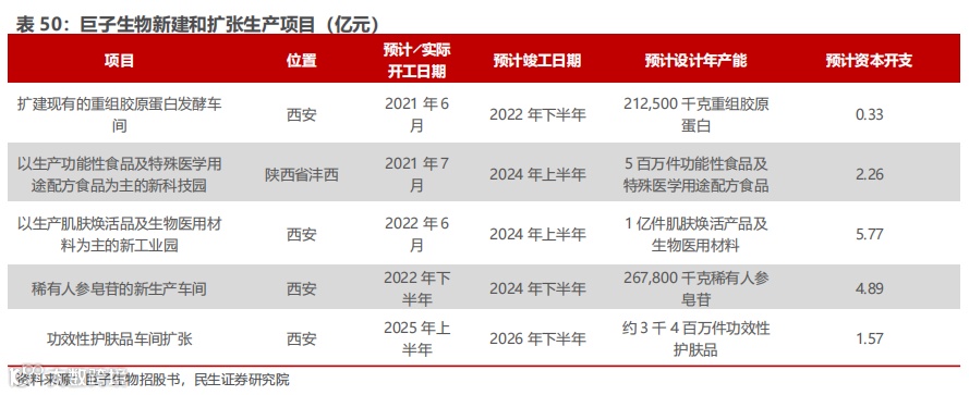 2)公司持续扩大生产线以提升产能,满足实现多样化产品线布局。截至2022年4月,公司拥有1条重组胶原蛋白生产线、1条稀有人参皂苷生产线、11条功效性护肤品生产线、6条医用敷料生产线以及2条功能性食品生产线。未来公司为实现品类的扩张,将加大产能建设,预计实施5项产能扩张计划,包括2条现有生产线以及新建3个生产工厂。