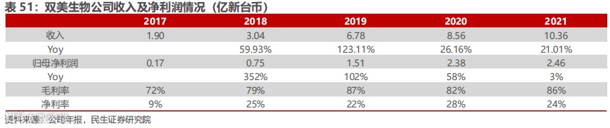 双美生物科技成立于2001年,在台南科学园区设立符合世界卫生组织定义的GMP(Good Manufacturing Practice)药厂。公司运用专利纯化技术技术研发了具有高度生物相容性、低免疫原性的生药级胶原蛋白原料。因其生产的胶原蛋白原料精良的纯度,双美生物的产品多运用在脑神经外科、眼科手术、牙科手术、骨科手术以及外科手术等医疗领域。2017-2021年公司收入由1.9亿新台币增长至10.3新台币,CAGR达到53%;归母净利润由0.16亿新台币增长至2.4亿新台币,CAGR达到96%。