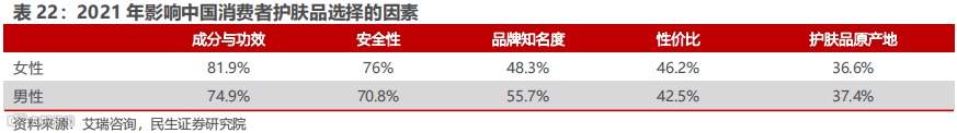 “Z世代” 消费群体护肤选择聚焦成分与功效性。据艾瑞咨询,2021年护肤品消费者中17-35岁人群占比超过70%,其中18-24岁达到39.5%,根据年龄分布,护肤核心群体为95后的“Z世代”人群;同时当前男性及女性消费者均将成分和功效作为影响其消费决策的最重要的因素。
