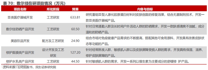 当前,敷尔佳研发方向集中于保养、护肤、修复方面。在研项目五类,包括:Ⅲ类医疗器械开发、敷尔佳防晒产品开发、美容饮品开发、修护面膜类产品开发和修护水乳类产品开发。其中Ⅲ 类医疗器械开发项目研究方向为重组Ⅲ型人源化胶原蛋白材料对皮肤创面的修复。
