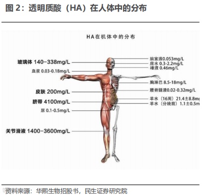 玻尿酸与胶原蛋白类似,同样存在于人体组织中,并起到保湿作用。玻尿酸又称透明质酸(Hyaluronic Acid),是一种由D-葡萄糖醛酸和N-乙酰葡糖胺合成名为“葡萄醛酸-N-乙硫氨基葡糖”的双糖分子单位重复连接而成的直链高分子多醣,广泛存在于人体结缔组织细胞外基质、神经组织以及真皮层中,人体中的透明质酸平均含量约为15g。玻尿酸的成分结构使其具备极强的锁水能力,1个玻尿酸分子可携带500倍以上的水分,进而起到补水保湿的效果。