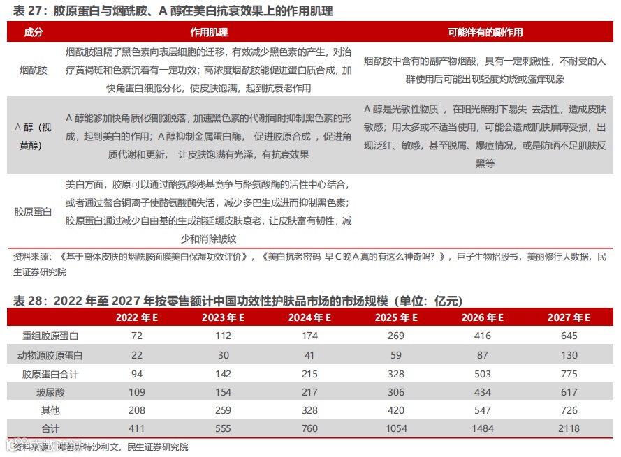 基于消费者未来的功效性需求,胶原蛋白将凭借自身多重功效特点突围,市场规模有望超越玻尿酸类护肤品市场。在美白和抗衰领域中,部分活性原料存在一定敏感性/刺激性,相比之下胶原蛋白不仅能够具备修护效果,还具备美白、保湿、抗衰等多样化功效,有望对当前部分活性成分实现替代,同时结合重组胶原蛋白技术的推动,胶原蛋白市场规模将呈现持续上行,据弗若斯特沙利文预测,2025年胶原蛋白类功效性护肤品将达到328亿元市场规模(其中重组胶原蛋白占比为82%),首次超过玻尿酸类功效性护肤品(市场规模为306亿元)。