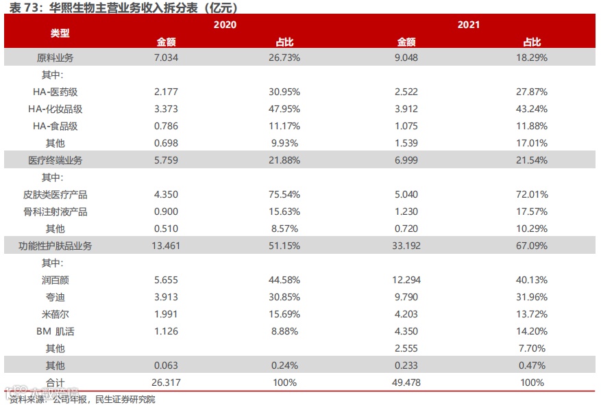 华熙生物围绕玻尿酸核心原料,进行多品牌布局。在医美业务上,华熙生物旗下有两个品牌——润致和润百颜;在医药领域有海力达、海视健、海润通等;在功能性护肤品核心品牌包括润百颜、夸迪、米蓓尔、BM肌活;2021年,公司布局功能性食品业务,推出三大品牌,包括玻尿酸水品牌“水肌泉”、透明质酸食品品牌“黑零” 和透明质酸果饮品牌“休想角落” 。
