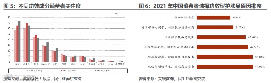湿、双抗、美白和修护。消费者选择功效性护肤品的主要原因集中在解决肌肤问题、追求成分安全和收效显著这三个方向,据美丽修行大数据统计,消费者在过去三年呈现持续较高需求的功效聚焦于保湿、抗氧化及抗衰和美白祛斑。对应2021年上半年功效性成分榜单可见保湿核心成分玻尿酸位居第一,其次为美白核心成分烟酰胺以及抗氧化抗衰作用的生育酚位居第三,具有较好修护效果的积雪草提取物位居第四,此外美白效果较好的光果甘草根提取物排名呈现快速上升。