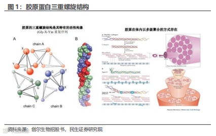 胶原蛋白呈三螺旋构象,使其具备相应的理化特性和生物学活性。胶原在结构上由三个自身按左螺旋排列的多肽链构成,三条相互独立的胶原蛋白肽链依靠甘氨酸之间形成的氢键维系三股螺旋相互缠绕的结构。众多胶原蛋白大分子又可彼此并排形成纤维互相交联的结构,使最终产物具备较高机械强度。胶原蛋白正常的三螺旋构象是其理化特性和生物学活性的基础,使其具备高拉伸强度、生物降解性能、低抗原活性、低刺激性、低细胞毒性。此外,胶原可直接与细胞表面受体结合,也可间接与其它中介分子结合后,参与细胞表面受体识别及信号传导过程,因此具备促进细胞生长、促进细胞粘附、与新生细胞和组织协同修复创伤等特性。