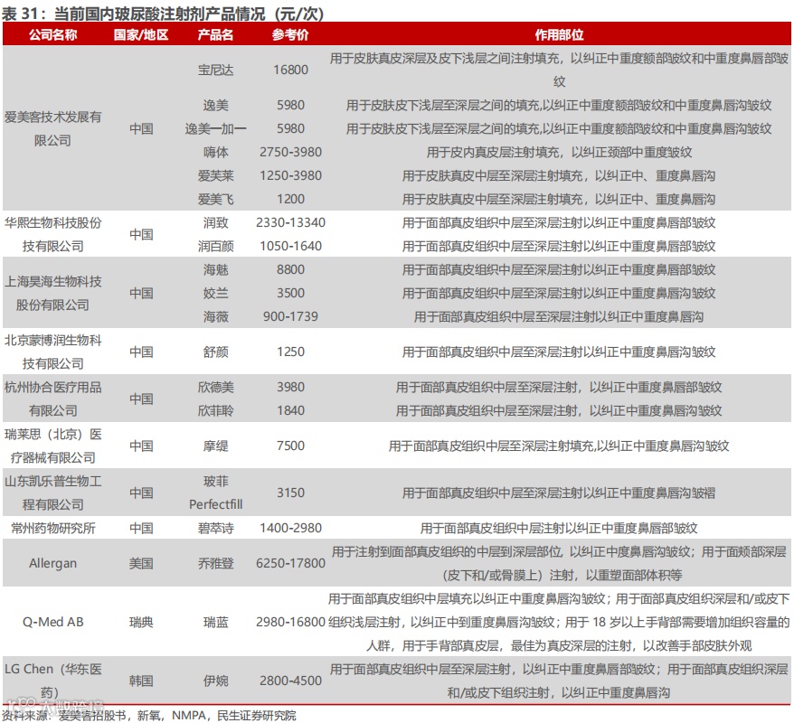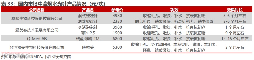 同时因受制于较高的产品获证要求,水光针市场合规“玩家”少。国家药监局发布了《医疗器械分类目录》调整公告,明确表示“水光针类”产品正式纳入III类医疗器械管理范畴。当下合规产品数量不多,除双美的胶原蛋白水光产品外,仅包括爱美客的嗨体2.5ml、冭活泡泡针,华熙生物的熨纹针、娃娃针、Q-Med的瑞蓝唯缇。