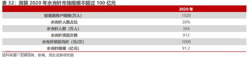 1)假设2020年水光针人数占轻医美用户的20%,对应水光针消费者人304万人;