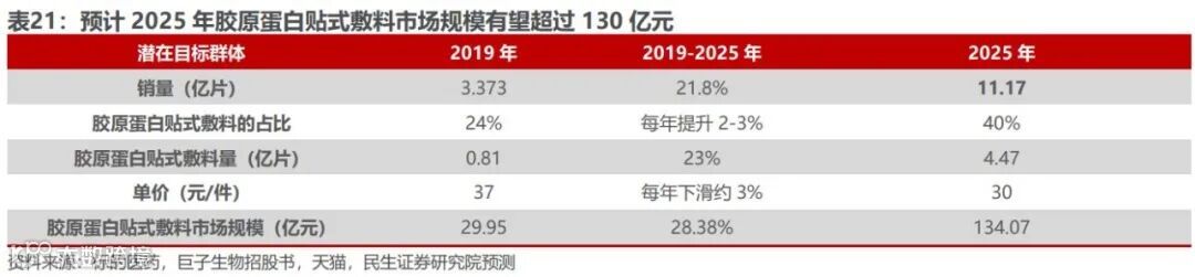 1)根据巨子生物招股书,2019年胶原蛋白类占医用敷料比重为22.2%,我们假设胶原蛋白类占贴式敷料比重为24%,随着重组胶原蛋白研发技术推进,未来以2-3pct速率提升占比,25年达到40%。