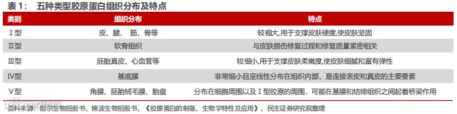 胶原蛋白广泛分布于人体结缔组织中,常见类型有五种。胶原蛋白是人体内非常重要的一类功能性蛋白质,广泛分布于人体的结缔组织中,如皮肤、软骨和骨、肌腱、韧带、 角膜、器官被膜、硬脑膜等。正常人90%的胶原存在于皮肤和骨头中,胶原约占真皮结缔组织的 95%;人体正常骨骼中含有 80%的胶原;肌腱组织中胶原含量高达 85%。截至目前已发现有27种胶原蛋白,最常见的为Ⅰ型、Ⅱ型、Ⅲ型、Ⅳ型和Ⅴ型,其中人体内含量比较高的Ⅰ型、Ⅱ型、 Ⅲ型胶原,占总胶原含量的 80-90%,均为成纤维胶原。