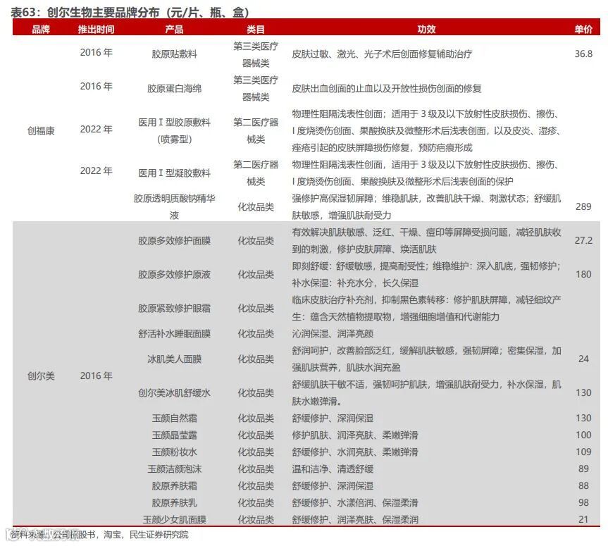 创尔生物拥有两大品牌,分别为创福康品牌和创尔美品牌。创福康成立于2004年,系列产品主要用于创面的辅助治疗,促进创面止血和修复,并可用于痤疮、皮炎、湿疹、皮肤过敏疾病的辅助治疗,产品包括胶原贴敷料、胶原蛋白海绵等,是胶原蛋白类敷料产品的领导品牌。2019年创福康的第二类与第三类胶原蛋白类敷料产品单片定价分别为25.2元、26.7元。创尔美品牌于2017年12月成立,其系列产品主要用于皮肤屏障护理、提升肌肤愈活能力,产品包括胶原多效修护面膜、胶原多效修护原液等。创尔美胶原多效修护面膜平均销售单价超过 25 元。
