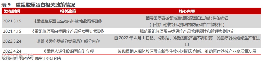 政策角度,通过制定标准、规范行业,推动重组胶原蛋白的研发和成果转型。重组胶原蛋白为新型生物材料的典型代表之一,国家药监局高度重视其标准化工作,过去两年内持续颁布相关法则,通过快速立项、快速制定标准通道,以创新监管思路加快推进创新成果转化。