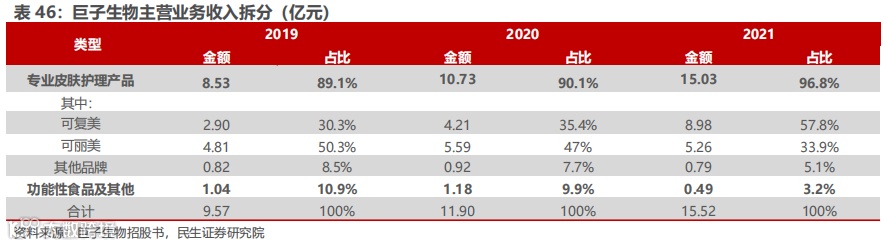 以专业皮肤护理产品为核心,深耕重组胶原蛋白细分赛道。公司为中国基于生物活性成分的专业皮肤护理产品行业的的先行者,通过其专有的合成生物学技术打造了以专业皮肤护理为核心、功效性食品以及其他产品为辅助的业务矩阵。公司的主要收入来自于专业皮肤护理产品,收入由2019年的8.52亿元增长至2021年的15.03亿元,CAGR达到32%,2021年占总收入96.8%。