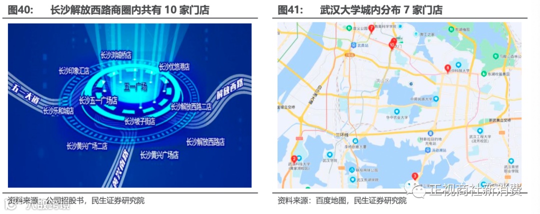 选址贴近年轻客群,兼顾高客流低成本。地段上,门店围绕客流高的高校和商圈布 局,海伦司“商圈店”和“校园店”的比例约 4:6。新生入学季、军训期间和毕业季高 校学生聚会需求激增,选址邻近高校,有利于吸引辐射范围内的潜在消费者。点位 上,选择高校周边、城市 CBD、运动馆区域内非核心位置,如商铺第二层/地下停 车场等,租金成本显著低于同地段临街商铺。海伦司品牌效应优、客群黏性强,可 利用线上社媒裂变及老顾客介绍新客的方式弱化点位带来的影响。